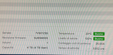 Vendo SSD NVMe Seagate FireCuda 530 da 4TB, uno degli SSD PCIe 4.0 più veloci disponibili. 📊 Stato SMART perfetto. Il disco è perfettamente funzionante e in stato SMART impeccabile (visibile nelle foto, con seriale corrispondente a quello dell’unità). Nota: nel conteggio delle unità di avvio vengono registrati anche i passaggi in standby del PC, quindi il numero "conteggi cicli di potenza" risulta molto più alto rispetto ai reali avvii del sistema. Per capire meglio: se in un giorno il pc va in standby 50 volte... conta 50 avvii in un giorno (tengo impostato il tempo di standby a 5 min). Caratteristiche principali: • Capacità: 4 TB • Interfaccia: PCIe Gen 4 x4 NVMe • Velocità fino a 7250 MB/s in lettura e scrittura • Ideale per workstation, gaming, editing video e trasferimento file pesanti Dotazione: • scatola originale • accessori inclusi 📄 Non dispongo dello scontrino (acquistato gennaio 2024). 📍 Consegna a mano a Roma (zona Marconi/EUR) con possibilità di fare qualsiasi prova. 📦 Spedizione disponibile esclusivamente tramite TuttoSubito. Prezzo: non trattabile • Non scambio • Se è online è disponibile