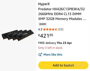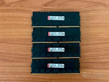 Vendo blocco completo da 64GB (4x16GB) HyperX Predator. Memorie ad alte prestazioni con timing CL15, perfette per workstation, video editing 4K e setup top di gamma DDR4. • Prezzo: 300€ trattabili (risparmio rispetto al kit singolo). • Consegna: Ritiro a mano a Pojana Maggiore o spedizione veloce via TuttoSubito. Per chi avesse bisogno solo di 32GB (2 banchi da 16GB a 160€) o 16GB (1 banco da 16GB a 80€) potete semplicemente contattarmi e vendo anche una gpu da workstation. Per ulteriori informazioni contattatemi pure. Ricordo che il prezzo e trattabile per tutti e tre i deal.
