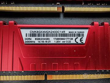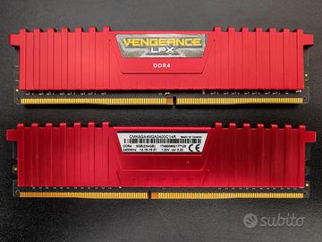 2x4GB DDR4 2400MHz Corsair Vengeance LPX Pari al nuovo. Caratteristiche tecniche: Capacità: 2x 4GB (totale 8GB) Tipo: DDR4 Frequenza: 2400 MHz Latenza: 14-16-16-31 Tensione: 1.20V Versione: 3.22 Modello: CMK8GX4M2A2400C14R Dissipatore: basso profilo rosso (LPX) Peculiarità: Kit dual channel Corsair Vengeance LPX di ottima qualità, ideale per upgrade su PC da gaming, ufficio o HTPC. Compatibile con la maggior parte delle schede madri DDR4. Design low-profile perfetto per dissipatori CPU alti o case compatti. Dotazione: 2 moduli RAM da 4GB ciascuno (kit completo) Nota: Pari al nuovo, testati e funzionanti senza problemi.