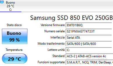- SSD SAMSUNG 850 EVO 240 GB: Salute 99% verificata. È il top dell'affidabilità, garantisce avvio rapido e zero attese. All'interno rimane presente un EMCC da 32GB che era l'orginale saldato alla scheda madre.