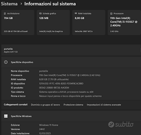 Ciao! Vendo Acer Aspire 3 A317-53-58D7 (17.3" Full HD 1920x1080 IPS), ideale per ufficio, studio, video e multitasking. Specifiche complete: CPU: Intel Core i5-1135G7 (11th Gen, 4 core/8 thread, fino 4.2GHz) RAM: 8GB DDR4 (espandibile a 16/32GB) Storage: Dual SSD NVMe - 256GB originale + 500GB aggiunto (totale ~756GB ultra veloci!) Batteria 81% (44 cicli) Grafica: Intel Iris Xe integrata Altro: WiFi 6, Bluetooth 5.0, Webcam HD, Windows 11 Home, HDMI/USB, caricabatterie originale Condizioni: Ottime, poco usato, batteria 81%+ (testabile), pulito, resettato. Nessun danno. Ultimo prezzo solo x oggi