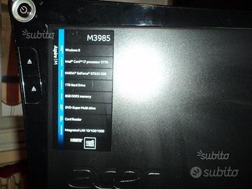 Acer 3985, Aspire. Frequenza del processore: 3,4 GHz, Famiglia processore: Intel Core i7-3xxx, Processore: i7-3770. RAM installata: 8 GB, Tipo di RAM: DDR3-SDRAM, RAM massima supportata: 16 GB. Capacità totale hard disk: 1000 GB, Supporto di memoria: HDD, Capacità hard disk: 1000 GB. Tipo drive ottico: DVD Super Multi. Scheda grafica dedicata: NVIDIA GeForce GT 620, Memoria dell'adattatore grafico discreto: 2048 GB, Modello scheda grafica integrata: Intel HD Graphics 4000