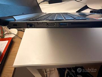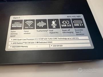Come da Titolo, perfettamente funzionante, normale segni di usura + batteria 90%. Caricabatterie originale. Il Laptop ha avuto una vita normale, no giochi, solo creazione documenti e modifica foto. Caratteristiche. CPU : AMD A12-9720P Quad-Core, TurboCore 3.60 GHz Memoria RAM: 16 GB DDR4-SDRAM. Archiviazione: SSD da 256 GB M.2 SATA3 Scheda Video1: AMD Radeon RX 540 con memoria dedicata 2 GB GDDR5 Scheda Video2 Apu: AMD Radeon R7 Schermo: Display LCD da 15,6 pollici HD con risoluzione 1366 x 768 pixel. Wireless: Wi-Fi 5 (802.11ac) + Bluetooth 4.0 Porte USB: 1x USB 3.1 Type-C (Gen 1) 1x USB 3.0 (con ricarica a computer spento) 2x USB 2.0 Uscita Video: 1x HDMI Rete: Ethernet Gigabit (RJ-45) Audio: Jack combinato cuffie/microfono, due altoparlanti stereo incorporati Espansione: Lettore di schede SD Webcam: HD (720p) con microfono digitale Sistema Operativo installato windows10 home .NO WIN11.