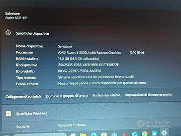 Vendo Acer Aspire A315-44P, acquistato il 08/07/2024 e usato pochissimo, praticamente nuovo.