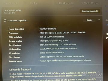 Vendo Pc portatile Acer Aspire E5-572, dotato anche di scatola originale, caricatore originale, borsa.