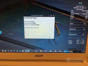 Netbook Aspire One D270 del 2012: smontato, pulito, sostituito pasta termica, batteria Cmos, Ram (portata due Gb ). Al posto del mio Ssd ho reinstallato il disco meccanico originale ( 320 GB ) su cui Antix funziona in modo accettabile per testarlo. Processore Intel Atom D2600 a 1,6 GHz, video integrato Intel GMA 3600 e Sistema Operativo Linux Antix 32 bit, che ho usato su questo Netbook e a mio giudizio ha dato ottimi risultati. Schermo da 10,1 pollici con retro-illuminazione a LED e risoluzione 1024x600. Disponibili a richiesta altre foto. La batteria dura circa 2 ore è mezza ma il suo stato non è rappresentato correttamente nell'icona, ho ovviato creando un altro percorso con allarme sonoro al 20% carica e consultabile da icona sul desktop come da prima foto. Esteticamente presenti segni d'uso minimi il più rilevante dei quali è evidenziato in ultima foto. Solo spedizioni con Subito.