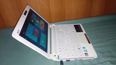 Acer Aspire One PC portatile 10 pollici con webcam alimentatore e batteria che resiste abbastanza. Ha un hard disk da 250 GB RAM il sistema operativo è Windows 10home sembra non avere limitazioni malgrado dà una segnalazione probabilmente errata di non attivazione. Monta il collaudatissimo Intel ATOM mod. N450 da 1.66 GHz. Manca un copri pulsante ma non è un problema perché il pulsante funziona perfettamente . Ritiro zona Monteverde eventuale spedizione pagamento anticipato no tuttosubito