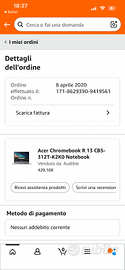 Acquistato online nel 2020 durante la pandemia per uso universitario. Vendo per regalo di MacBook. Ottimo prodotto soprattutto per chi utilizza le funzionalità Google (Gmail, Google drive, figli Google, Google Meet ecc). Molto veloce ed efficace, touch, leggero. Sistema operativo Chrome OS. Incluso carica batteria. Condizioni ottime, come in foto. Prezzo di acquisto 429,10€ come si vede dalla foto
