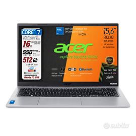 Acer Aspire, Notebook Intel Core 7 150u 10Core, fino a 5,4GHz, Raptor Lake, Ram 16Gb, SSD Pcie 512Gb, Display 15,6" FHD Antiriflesso, BlueLightShiled, Type-c Display port over USB, Win 11 64Bit , Ready to Use, Garanzia Italia ➡️ ➡️ Caratteristiche tecniche principali : Notebook Acer modello Aspire - Edizione Dedicata - nuova CPU Intel Core7 -150u RaptorLake, 10Core - Modalita Burst Mode automatica fino 5,4 Ghz. Scheda Video Intel UHD - Display LCD Antiriflesso | Diagonale 15,6" Risoluzione: 1920 x 1080 pixel FHD ultra sottile, ULTRALEGGERO , 1,53Kg - Memoria RAM installata 16GB DDR4 3200 MHz ESPANDIBILE 2 SLOT. - SSD Nvme da 512Gb M.2 PCIe. ➡️ ➡️ Altre caratteristiche tecniche : tastiera Italiana QWERTY FullSize con pad numerico - WebCam HD a colori con microfono incorporato, 2 ALTOPARLANTI INTEGRATI - 1 x HDMI 2.0 - 4 x USB -bluetooth - WI-FI 6 UltraSpeed - 2 PORTE USB-TYPE C Funzioni complete - 1 x Jack 3,5" Combo cuffie/microfono - 1 x alimentatore C/A incluso Italiano. ➡️ ➡️ Consigliato per : utilizzo professionale, aziendale, fotoritocco Design UltraSlim : peso : 1.53 kg - Dimensioni : 35,770 cm x 23,440 cm x 1,79 cm, colore Grigio silver, la durata della batteria varia in base all'utilizzo ed al setup da un minimo di 2 ore ad un max di 6 ore ➡️ ➡️Pronto all'utilizzo immediato : installazione di tutti i driver di sistema. Non necessita di inizializzazione, produttivo al primo avvio Suite software : preconfigurazione di Win 11 64-bit, Suite Open Source Libre Office , Antivirus ed utility indispensabili Ogni singolo prodotto prima della spedizione viene scrupolosamente testato preconfigurato e riconfezionato, per garantire un alto standard di qualità, supporto sempre garantito : garanzia Italia 2 anni