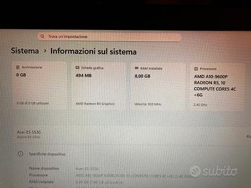 Vendo computer portatile laptop Acer E5-553 Ram Ddr4 con 8 gb supporta 32 gb
