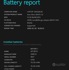 Ciao a tutti! Vendo questo fantastico pc portatile da gaming: Acer Nitro V15 (Obsidian Black). II computer è stato utilizzato veramente pochissimo, ciò è dimostrabile dal battery report (foto numero 6), che indica una capacità residua della batteria del 100%. Il pc è capace di erogare prestazioni veramente incredibili (riesce a far girare anche gli ultimi giochi rilasciati ad alti fps) e possiede un sistema di raffreddamento impressionante (raro per questi tipi di portatile). Possiede inoltre il comodissimo software NitroSense (che vi consiglio di usare), dove è possibile gestire e monitore qualsiasi tipo di impostazione che riguarda le prestazioni, le temperature, il tipo di alimentazione, la velocità delle ventole, la retroilluminazione della tastiera, il filtro allo schermo per la protezione degli occhi, ecc. Specifiche: • Processore: Intel Core 17-13620H (potentissimo e perfetto per gaming, streaming ed editing di foto e video). • Scheda Video: NVIDIA GeForce RTX 5050 con 8 GB di VRAM GDDR7 dedicata. La serie 5 è l'ultima serie di schede video rilasciata da NVIDIA, dunque sarete apposto per tanti anni, senza alcun tipo di compromesso. • Display: 15.6" Full HD IPS a 165Hz. Colori perfetti e una fluidità pazzesca, ideale per gaming ed editing vario. • Memoria e Archiviazione: 16 GB di RAM DDR4 e un SSD PCle NVMe ultra-veloce da 512 GB. Forse vi è la possibilità di aggiungere anche un NVMe da 1Tb di memoria (se siete interessati scrivetemi pure in chat) Il po è perfetto per qualsiasi tipo di attività, anche universitaria (usato personalmente sia per programmazione che per modellazione 3D, ed è una bomba). Includo ovviamente scatola e caricabatterie originale. Se siete di Torino, e volete provarlo prima di acquistarlo, non c'è alcun tipo di problema :) Scrivetemi pure per qualsiasi info o per altre foto!