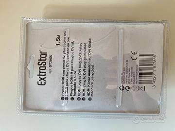 Presa HDMI con presa DVI placcato oro, lunghezza cavo 1,50 metri in confezione originale, supporta la tecnologia 3D. marca: ExtraStar Ref.: ST3055 Semplicemente per collegare apparecchiature HDMI dove si richiede di garantire la maggior qualità possibile delle immagini cinematografiche. Prodotto nuovo e mai usato, confezione aperta per fare le foto. Prezzo non trattabile. Prezzo esente IVA (art. 36 e seg. DL 41/95 su beni usati) Pagamento PayPal accettato Spedizione gestita da Subito. Le foto pubblicate corrispondono a ciò che vi verrà spedito.