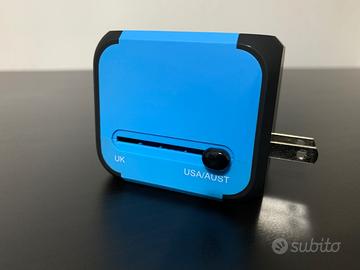 Comodo ed estremamente compatto adattatore da viaggio multipresa Europa, UK, USA/AUST + USB.