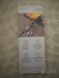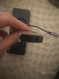 Serve per collegare cuffie con jack audio da 3,5 mm a dispositivi dotati solo di porta USB C, come smartphone, tablet o computer moderni. • Permette inoltre di ricaricare il dispositivo contemporaneamente durante l'uso delle cuffie. • L'adattatore è composto da un connettore USB C maschio che si inserisce nel dispositivo. • È collegato tramite un cavo corto a un piccolo modulo con due porte. • La prima porta è un ingresso jack audio da 3,5 mm per cuffie o auricolari. • La seconda porta è una porta USB C con tecnologia Power Delivery per la ricarica. • Il cavo è rivestito in materiale intrecciato per garantire maggiore resistenza e durata nel tempo. • La struttura del dispositivo è realizzata in alluminio, che offre robustezza e una migliore dissipazione del calore. • Questo tipo di adattatore è utile soprattutto per dispositivi che non dispongono più del jack audio tradizionale. • Consente di ascoltare musica o effettuare chiamate mantenendo il dispositivo in carica. • È compatto, leggero e facilmente trasportabile, adatto all'uso quotidiano sia in casa che in mobilità.