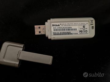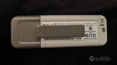 USB adapter wireless 802.11g D-Link DWL-G122 versione C1, 54 MBPS, 2.4 GHz, interfaccia USB 2.0. Distanza massima teorica supportata: 70 m indoor, 150 m outdoor. Cifratura WPA.