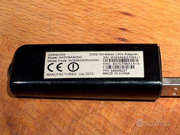 Vendo adattatore originale Samsung Wireless LAN Adapter (mod. WIS09ABGN2) per Smart TV e PC. La chiavetta è stata appena testata: come visibile in foto, una volta collegata viene correttamente rilevata dal sistema come "802.11n USB Wireless LAN Card", confermandone il pieno funzionamento.