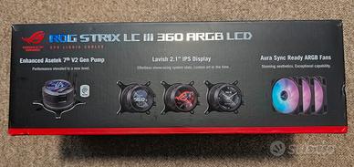Vendo per cambio progetto dissipatore a liquido Asus ROG Strix LC III 360 ARGB LCD, acquistato su Amazon a inizio aprile 2026 e utilizzato solo per poche ore. L'oggetto è impeccabile, privo di segni di usura e completo di ogni accessorio; le ventole hanno ancora le pellicole protettive originali. Caratteristiche e Performance: Il dissipatore monta la nuova pompa Asetek 7ª gen V2 per il massimo della silenziosità e ventole da 120mm ROG ARGB ad alta efficienza e pressione statica, compatibili con i sistemi Argb dei principali produttori (Asus Aura Sync, MSI Mystic Light, Gigabyte RGB Fusion, ASRock Polychrome, ecc.), o software come SignalRGB e OpenRgb. Display LCD da 2.1" magnetico e ruotabile, che permette un'installazione flessibile in ogni direzione senza perdere l'orientamento corretto di GIF o statistiche di sistema. Compatibilità e Garanzia: È compatibile con i socket più recenti, inclusi Intel LGA 1851, 1700, 1200, 115X e AMD AM5/AM4. Il prodotto gode di 6 anni di garanzia ufficiale e non è ancora stato registrato sul sito Asus, operazione che potrà fare il futuro acquirente. Note sulla vendita: Prezzo affare poiché è scaduto il periodo di reso Amazon da pochi giorni. Se richiesto fornisco fattura d'acquisto via email solo dopo la conferma di ricezione. Disponibile per scambio a mano o spedizione tramite TuttoSubito. Astenersi affaristi, perditempo ed indecisi.