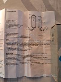 Strumento portatile di misurazione livello alcol nel corpo. Utilizza 2 pile AAA di 1,5 v. Con istruzioni d'uso. Usato una sola volta per prova.