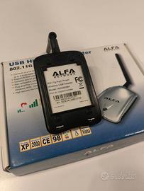 Vendo storico adattatore Wi‑Fi USB Alfa Network AWUS036H, versione high power 802.11b/g con antenna esterna removibile RP‑SMA, ideale per aumentare la portata del segnale wireless su PC e portatili. In dotazione l’adattatore con antenna e scatola originale, come in foto; supporta vecchi sistemi Windows (98, 2000, XP, Vista, 7), Mac OS X e varie distribuzioni Linux tramite driver dedicati scaricabili dal sito Alfa. Usato ma funzionante quando riposto, lo vendo per inutilizzo a chi può sfruttarlo ancora o collezionarlo.