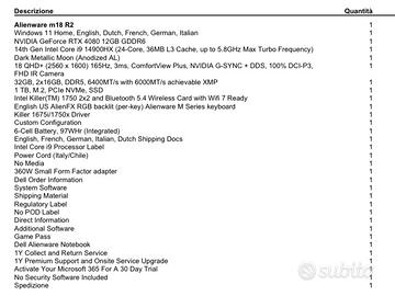 Vendo Alienware m18 R2 acquistato a febbraio 2025 sul sito ufficiale Dell.