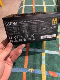 Vendo alimentatore *Cooler Master MWE Gold 650W*, completamente modulare, certificazione *80 Plus Gold*. Usato, in *buone condizioni estetiche*, silenzioso e con cavi inclusi.
