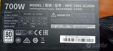 Alimentatore per PC Cooler Master MWE 700 White 230V V2: - Potenza: 700W - Certificazione 80 PLUS Bronze - Modello: MPE-7001-ACABW Vendo per passaggio a modello superiore.
