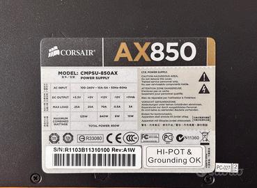 Vendo alimentatore Corsair AX850 in eccellenti condizioni estetiche e funzionali, compreso di cavi. Senza scatola e senza cavo di alimentazione.