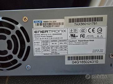 Vendo alimentatore perfettamente funzionante sono stati cambiati tutti i condensatori -Produttore: Enertronix -Modello: EXADD220 Potenza: 220W -Tensione: 110-120V / 220-230V, 6A / 3A, 60/50Hz - Connettori: ATX 24 pin / 12V 4 pin / 2x MOLEX / 4x SATA Mini atx modello EXADD220