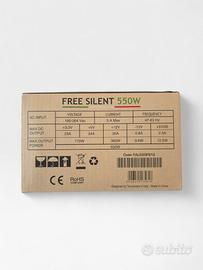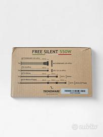 Vendo alimentatore per PC desktop marca Tecnoware, modello "Free Silent 550W" (Codice: FAL550FS12). Il prodotto è nuovo e mai usato, completo di confezione originale. L'imballaggio è stato aperto solo per scattare le foto. Specifiche Principali (visibili in foto): - Potenza Totale: 550 Watt max. - Raffreddamento: Ventola intelligente da 12cm (Intelligent Fan), progettata per la silenziosità (Silent). - Connettore CPU: 4+4 PIN 12V CPU. - Efficienza: Alta efficienza dichiarata dal produttore. - Packaging: 100% Paper Packaging (confezione in carta riciclabile). - Origine: Progettato da Tecnaware in Italia (Made in China), qualità italiana dichiarata. Dettagli Tecnici (Output): - +3.3V: 23A - +5V: 24A - +12V: 30A (Max 360W) - Combinata +3.3V e +5V: Max 170W Lunghezze Cavi: - Motherboard (20+4Pin): 350mm - CPU (4+4Pin): 350mm - SATA+Molex: 350mm + 150mm - SATA+Molex+Floppy: 350mm + 150mm + 150mm