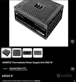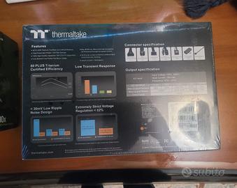 vendo alimentatore pc NUOVO IMBALLATO ANCORA DA APRIRE, THERMALTAKE 1550W ultra high end alte prestazioni PLATINUM. 3 ANNI ANCORA IN GARANZIA, in quanto ho avuto un thermaltake da 1475w rotto e mandato in RMA e mi hanno spedito questo nuovo, quindi ancora in garanzia altri 3 anni rimanenti. io nel frattempo che aspettavo ne ho preso un altro come in foto per non rimanere senza per questo lo vendo.