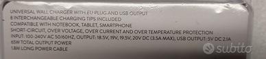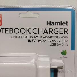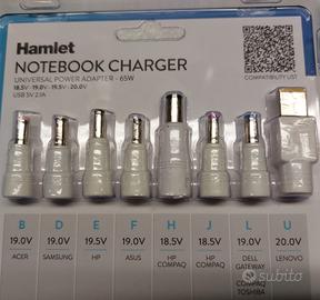 Alimentatore universale per notebook marca Hamlet, fornito di tutti gli adattatori per tutti i tipi di portatili. 65W