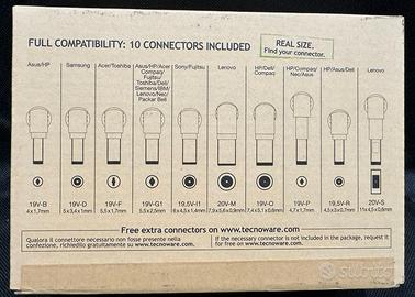 Alimentatore universale Tecnoware 95W, con 10 connettori intercambiabili. Selezione automatica del voltaggio Lunghezza cavo 2,6 mt