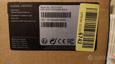 Alloggiamento unità grafica esterna, Razer Core X usato poco. ThunderBolt 3, USB C, PSU 650W Windows, Mac. Cavo alimentazione, cavo usb C, scatola. 200 Euro piu spese di spedizione.