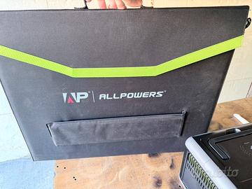 Ciao vendo ALLPOWERS R600 Power Station con suo pannello solare sp027 100w Il tutto nuovo usato solo per fare un video Specifiche delle caratteristiche 600 Watt Generatore solare, Power station portatile (Pannello Solare 200 W) per alimentazione di riserva domestica, campeggio, camper ed emergenze. Uscita CA da 600 W (picco 1200 W). Batteria al LiFePO4 da 299Wh. Ricarica rapida CA da 400 W, 0-100% in 1,5 ore. Generatore solare, ricarica solare massima 200 W. Alimenta 8 elettrodomestici contemporaneamente. 3 modi per caricare (auto+AC+caricatore solare). UPS Gruppo di continuità affidabile.