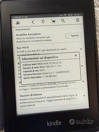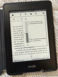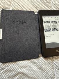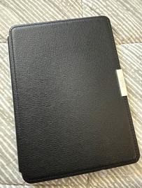 Amazon Kindle Paperwhite di 5 generazione Con illuminazione integrata per leggere al buio Con custodia originale Kindle in pelle (o ecopelle, non so) nera, bella, elegante e senza alcun segno di usura, che blocca il dispositivo in automatico all’apertura e lo blocca alla chiusura. Il dispositivo non è mai uscito dalla cover in quanto non mi piace la sensazione “antiscivolo” della plastica gommata Fornisco anche cavo originale Kindle da USB a USB mini. Perfettamente funzionante