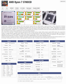Vendo amd ryzen 7 5700x3d, per passaggio ad AM5, perfettamente funzionante ( vedi foto cinebench 2026). Spedizione con corriere tracciabile.