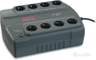 UPS in ottime condizioni con imballo originale (quindi nessun problema per l'eventuale spedizione), perfettamente funzionante. Questo Back-UPS APC offre alimentazione e protezione dai picchi per reti wireless, computer, console di gioco e altre apparecchiature elettroniche domestiche e aziendali. L'UPS da 400 VA da pavimento/a parete ha 8 prese totali, 4 delle quali sono batteria di backup e protezione da sovratensioni, e 4 sono solo protezione da sovratensioni. È compatibile con una batteria dedicata sostituibile dall'utente per ripristinare le prestazioni originarie dell'UPS. La spina d'alimentazione schuko è stata sostituita da una italiana angolare salvaspazio (vedi foto). Per una maggiore affidabilità è consigliabile, seppur non necessariamente, sostituire la batteria.