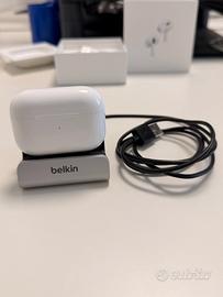Apple AirPods Pro 2 originali, complete di scatola, cavo, gommini nuovi e basetta Belkin in omaggio. Perfettamente funzionanti, batteria ottima, solo custodia con segni estetici da uso normale.