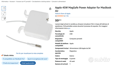Vendo alimentatore APPLE modello MC747Z/A per MCBOOK AIR NUOVO mai usato, ancora sigillato nel suo incarto.