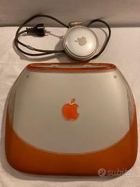 iBook G3 Clamshell - Vintage - acquistato anno 2000 Tangerine. Funzionante. Forma "a conchiglia" (clamshell) con una maniglia per il trasporto, rivestito in gomma colorata e policarbonato trasparente. Completo di manuale, guida, disco di software restore. Processore: PowerPC G3 a 300 MHz - Schermo LCD a matrice attiva da 12.1 pollici (risoluzione 800x600). Qualche piccolo segno di uso e di età come un punto di usura del cavo dell'alimentatore comunque funzionante e originale. Non ho più scatola originale. Sarebbe preferibile consegna in presenza.