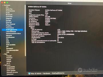 Vendo Apple Imac 21,5 del 2012 processore i5 scheda grafica Nvidia GT 640M modificato con 2 ssd da 256 gb ed 8gb di ram. Sistema operativo MacOs Sonoma di ultima generazione perfettamente funzionante ed operativo in ogni sua componente. E' presente un colpo in alto a destra dello schermo ma non influisce sulla qualità grafica della macchina. Viene venduta solo quello che vedete nella foto ed il cavo di alimentazione. Viene venduto visto piaciuto sono a disposizione per ulteriori informazioni. Si prega di evitare di perdere tempo con offerte ridicole.