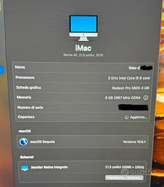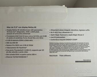 Prezzo trattabile. Apple IMAC 21.5"RETINA 4K 15 8TH 8GB 256GB PRO560X OS МHK33TA. Modello A2116 (2019). Comprato nel 2021. Esteticamente praticamente impeccabile. Sempre stato fermo nella stessa postazione in casa. Con tastiera no mouse.
