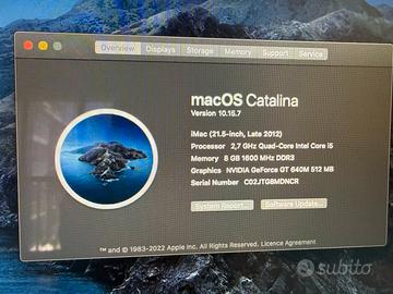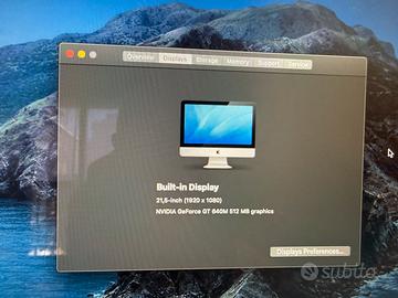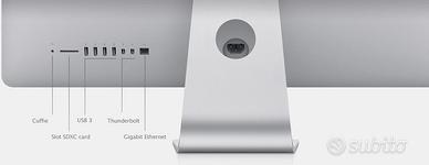 Computer all-in-one Apple iMac 21.5” completo di tastiera e di mouse perfettamente funzionante e tenuto benissimo (nessun segno o ammaccatura). Edizione late 2012. Dotato di SSD da 250 GB ! La sostituzione del disco meccanico originale lo ha reso molto performante e veloce. Perfetto per utilizzi da casa standard compresa videoconferenza (comprende videocamera e casse acustiche integrate). Linea apple come sempre di design raffinato. Porte di connessione: 4 x USB 3; 2 x thunderbolt (con funzione display port per ulteriore monitor esterno); slot SDxc card; porta ethernet RJ-45.