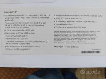 Vendo computer fisso APPLE IMAC 21,5 pollici. Acquistato presso Mediaworld mediante il Bonus Docenti nel 2019. Tutto originale: tastiera, mouse, cavi, imballi. Perfetto. E’ inusato da tre anni (sostituito da un normale PC). Caratteristiche (come da etichetta fotografata): Schermo retroilluminato Led panoramico 16:9 da 21,5”; 1920 x 1980 pixel; sensore di luminosità ambientale Processore Intel Core i5 dual-core a 2,3 GHz con 64 MB di eDRAM e 4 MB di cache L£ condivisa (Turbo Boost fino a 3,6 GHz) 8 GB di memoria DDR4 a 2133 MHz Disco rigido da 1 TB a 5400 giri/min Intel Iris Plus Graphics 640 Videocamera HD FaceTime Due porte Thunderbolt 3 (USB-C) ; supporto per I/O ad alta velocità e uscita video Slot scheda SDXC e quattro porte USB-A Ethernet 10/100/1000BASE-T Altoparlanti stereo integrati, microfono, ingresso cuffi Wi-Fi 802.11ac e Bluetooth 4.2 Apple Magic Keyboard e Apple Magic Mouse 2 mac OS preinstallato Conforme ai requisiti ENERGY STAR Tel. 3483659235