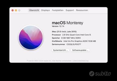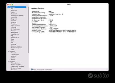 Anno di produzione: fine 2015 •Processore:2,8 GHz Quad-Core Intel Core i5 •Memoria di massa: 250 GB SSD • Sistema operativo: macOS Monterey 12.7.4 • Scheda grafica: Intel Iris Pro Graphics 6200 1536MB • RAM: 8 GB DDR3 1867 MHz •Display:21,5" display •Wireless: Wi-Fi, Bluetooth •Connettività: 4x USB, 2x Thunderbolt 2, Ethernet, audio 3,5 mm, porta SD