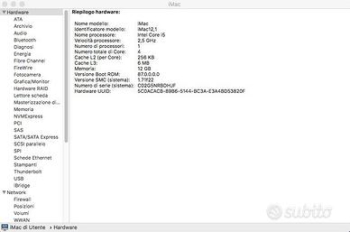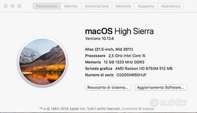 Vendo iMac 21,5 mid 2011 con SSD Lexar da 480 GB, montato da poco e ancora in garanzia amazon. Il Mac è in ottimo stato e non presenta graffi. Vendo con tastiera originale Apple e magic mouse, entrambi nuovi e utilizzati solo poche ore. Inoltre il Mac ha 12GB di Ram. E' presente l'ultimo aggiornamento disponibile, ovvero il macOS High Sierra. Senza scatola originale.