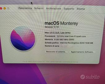 apple imac 21,5 late 2015 cpu Intel i5 quad core 2,8 GHz memoria 8GB 1867 ddr3 grafica Intel iris pro 6200 1536 MB SSD 480 GB KINGSTON (NUOVO) schermo 21,5" res. 1920x1080 PRODOTTO PERFETTAMENTE FUNZIONANTE VENDUTO SENZA MOUSE/TASTIERA
