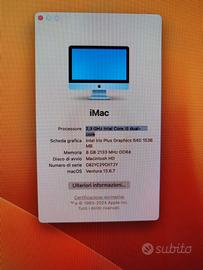 Vendo Apple iMac di 21,5 pollici in perfette condizioni comprensivo di magic tastiera e magic mouse. Usato pochissimo, tenuto come nuovo. Vedi la terza foto che indica tutte le caratteristiche.