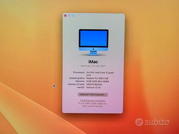 Apple iMac 21,5 pollici (2017) Retina 4K - memoria 8 GB - disco 1 TB - sistema operativo Ventura 13.7.8 ricondizionato. Lieve ombra sullo schermo in basso a sinistra.