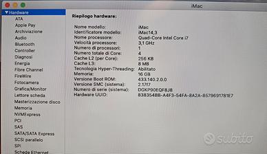 modello iMac14,3 del 2015 con processore Intel Core i7 quad-core a 3,1 GHz, 16GB RAM, disco principale da 128GB (dove è installato il sistema operativo macOS) e SSD secondario da 1TB (visualizzato ma non più accessibile a causa di danneggiamento hardware).